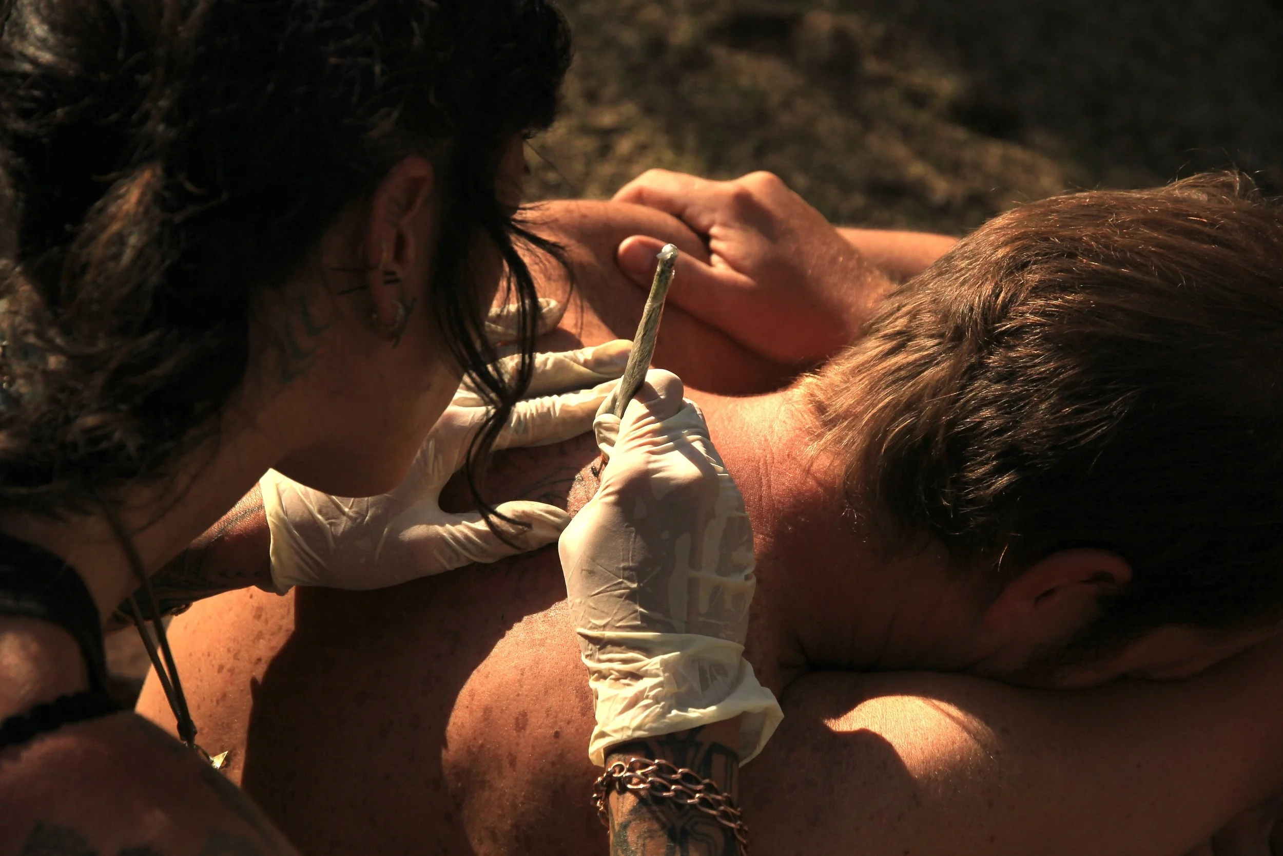 Hand tattooing is an ancient primitive art form that differs immensely from machine tattooing, and potentially initiates a journey that transcends the physicality of the image in the skin. The simplicity of the hand made instruments that I use, create unique vital experiences.